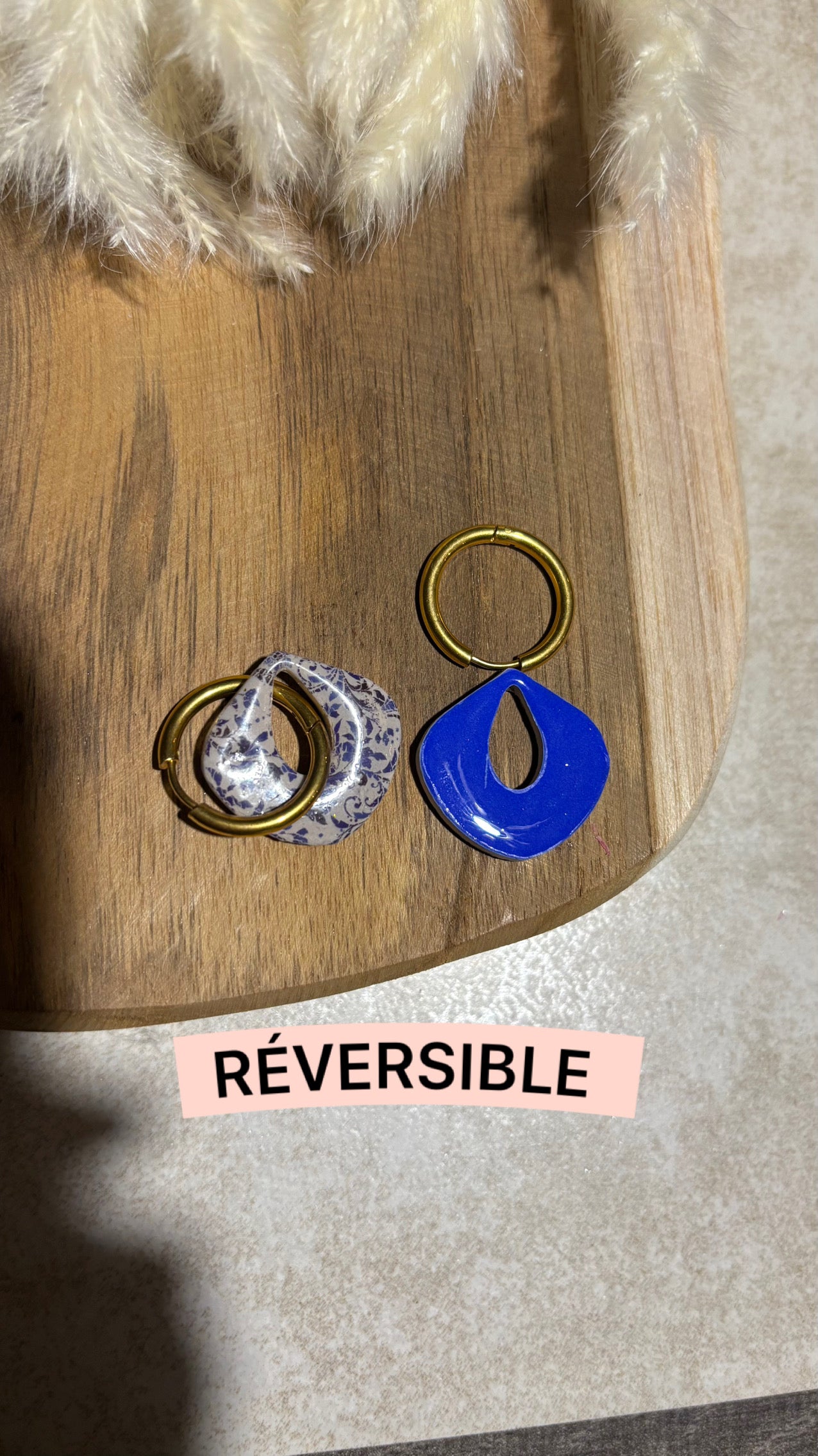 Bijou façonné à la main en pâte polymère, recouvert d’une couche de résine pour le protéger et lui apporter de la brillance.